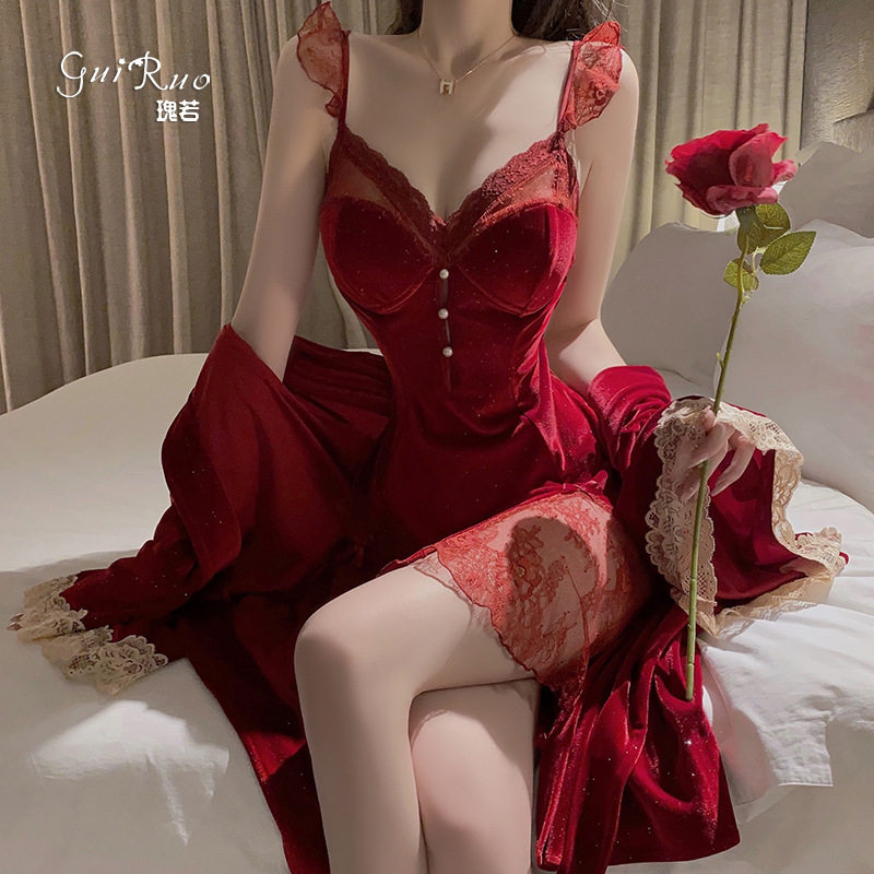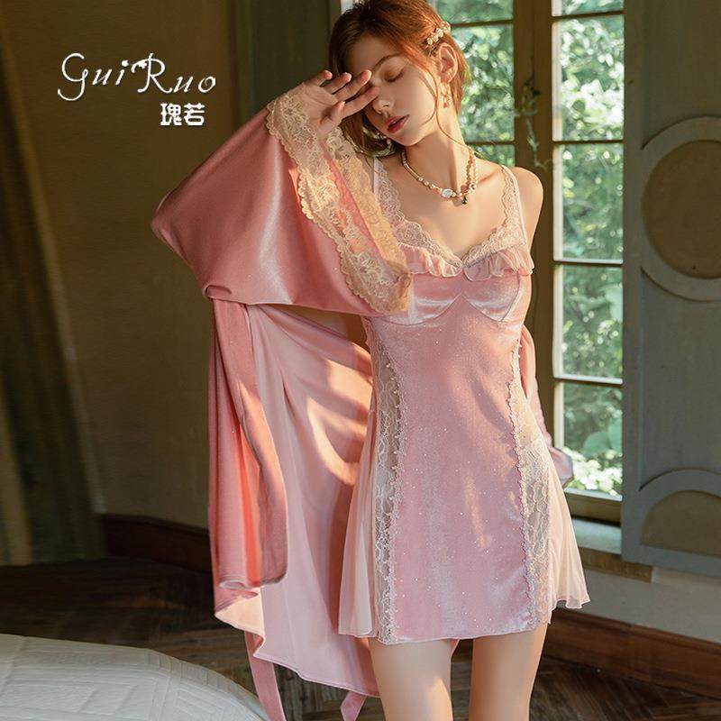 秋冬最新款性感深V亮闪丝绒蕾丝加胸垫纯欲露背睡裙外袍家居套装
