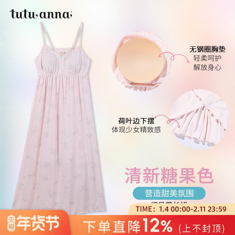 tutuanna印花吊带裙长款睡裙宽松春夏薄款家居服带胸垫女露背睡裙