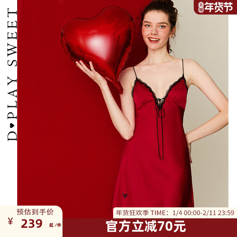 DPLAYSWEET法式简约红色本命年结婚吊带露背睡裙缎面舒适睡衣冬季