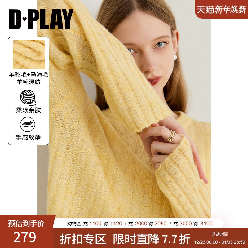 DPLAY2025年秋季新款黄色针织衫女含马海毛羊驼毛羊毛亮片上衣
