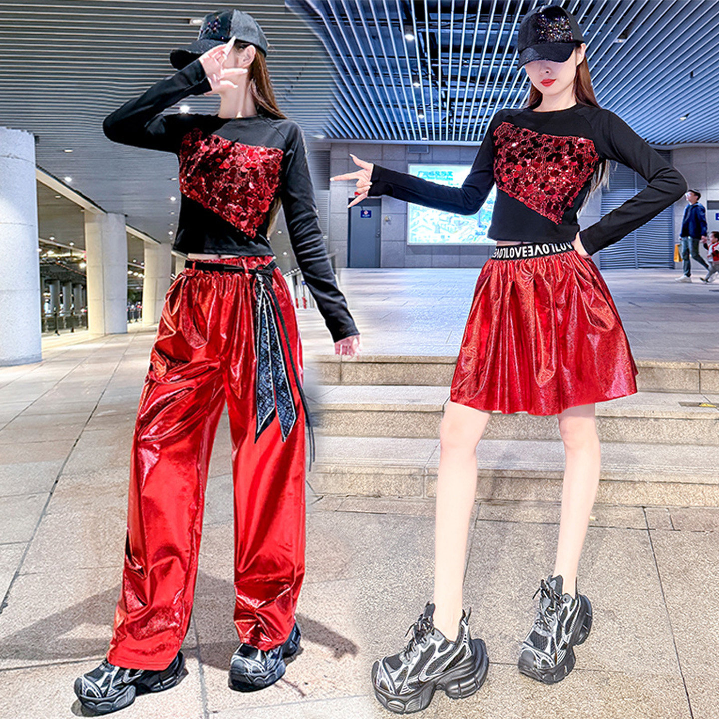 亮闪闪女团跳舞演出服爵士舞时尚亮片上衣反光阔腿裤嘻哈表演套装