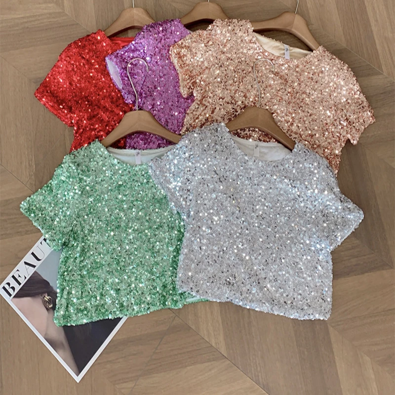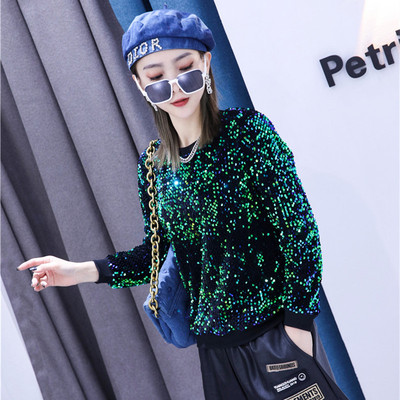 亮片上衣舞台表演服渐变闪闪亮亮晶晶圆领套头短款长袖卫衣女外套