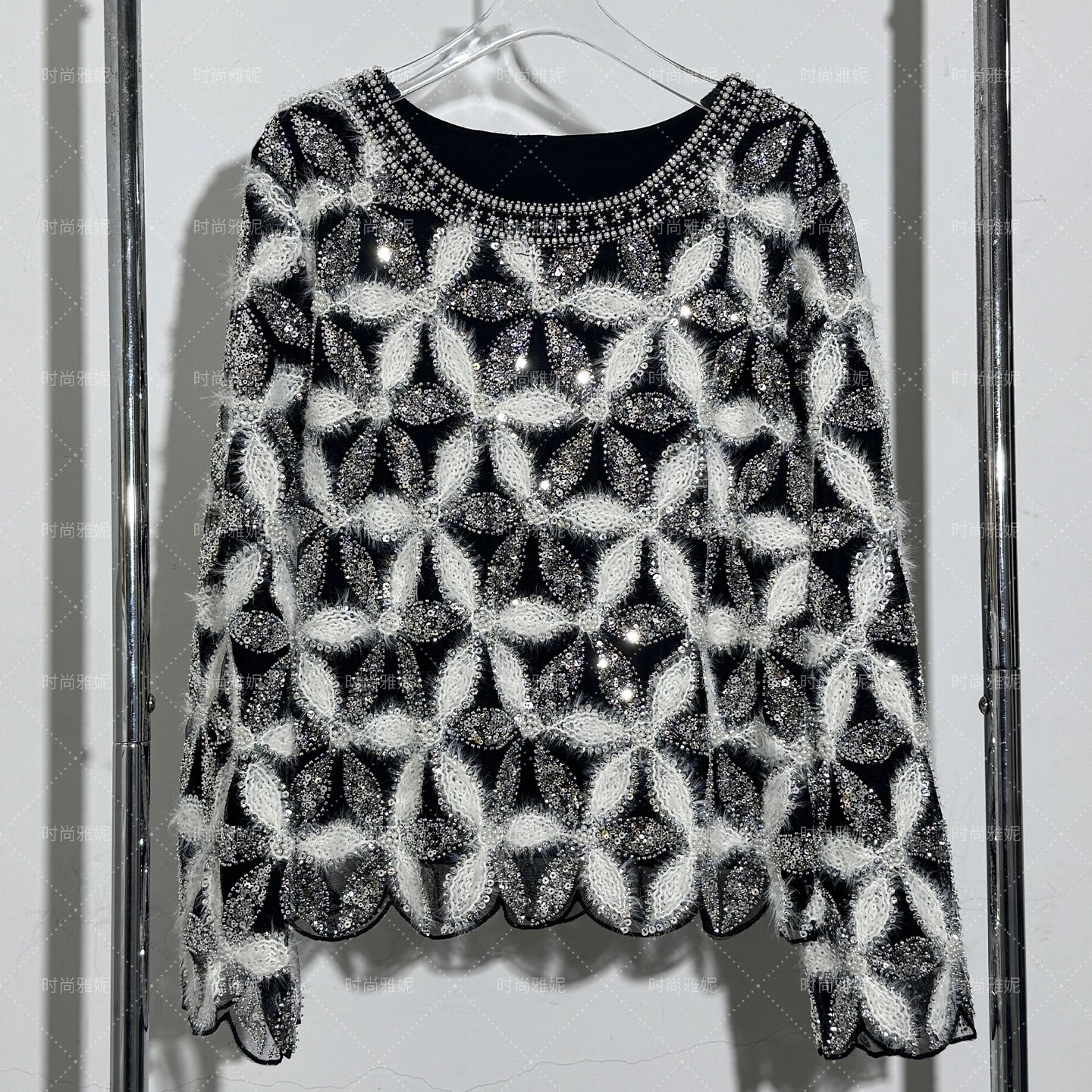 时尚雅妮重工花朵女圆领长袖设计感复古气质百搭珍珠钉珠亮片上衣