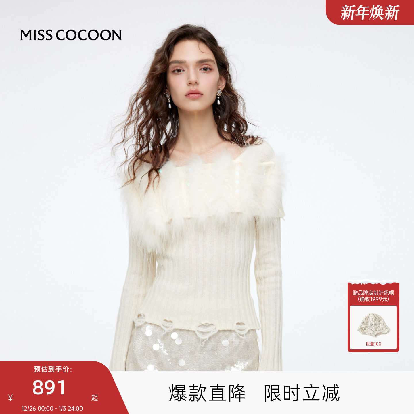 MISSCOCOON可可尼破洞亮片上衣女2025冬新款温柔方领貉子毛针织衫