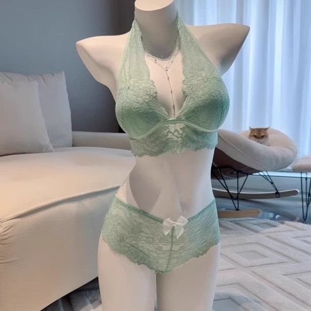 薄荷绿纯欲蕾丝挂脖外穿内搭带胸垫背心无钢圈美背内衣文胸套装女