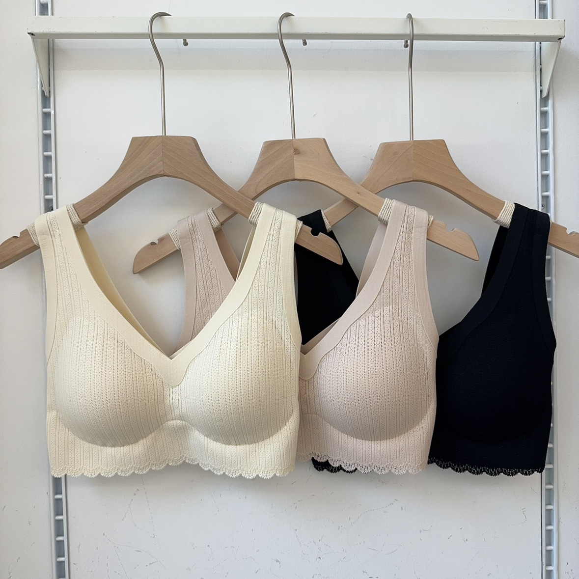 2025春夏新款桑蚕丝无痕缎面蕾丝拼接吊带固定杯无钢圈美背内衣女