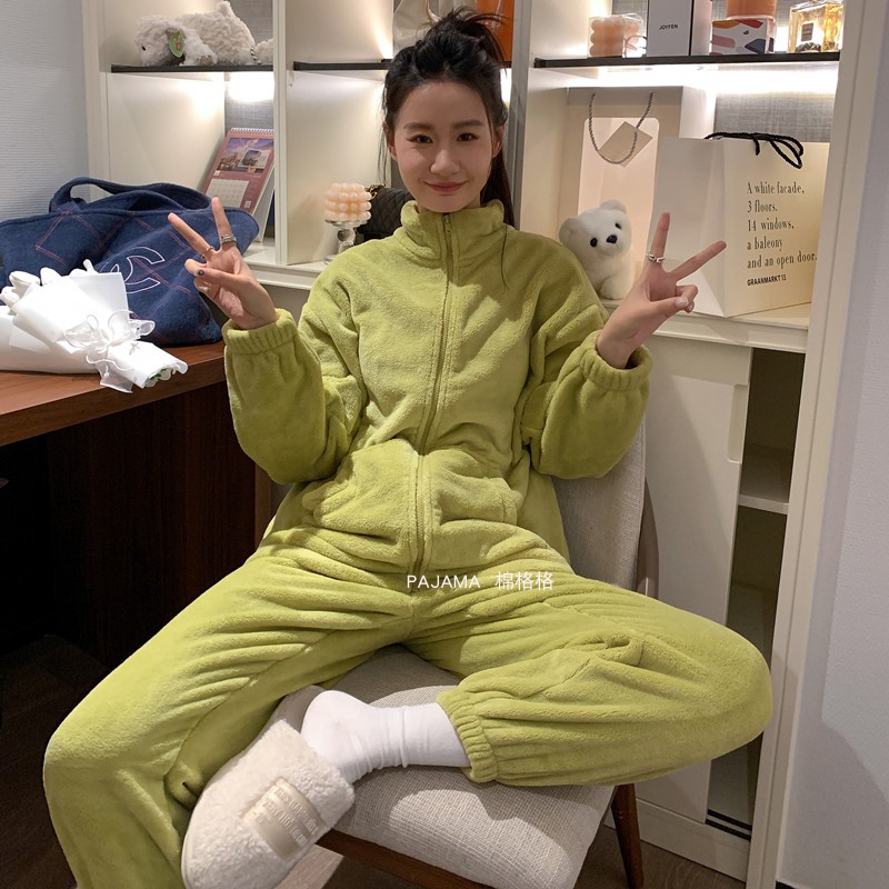 珊瑚绒秋冬季加厚睡衣女家居服开衫拉链款韩版纯色保暖套装可外穿
