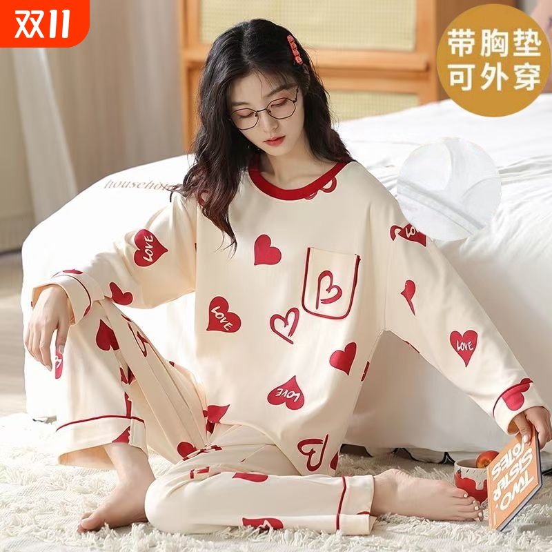 韩版带胸垫纯棉睡衣女士春秋冬季长袖套装休闲可外穿家居服两件套