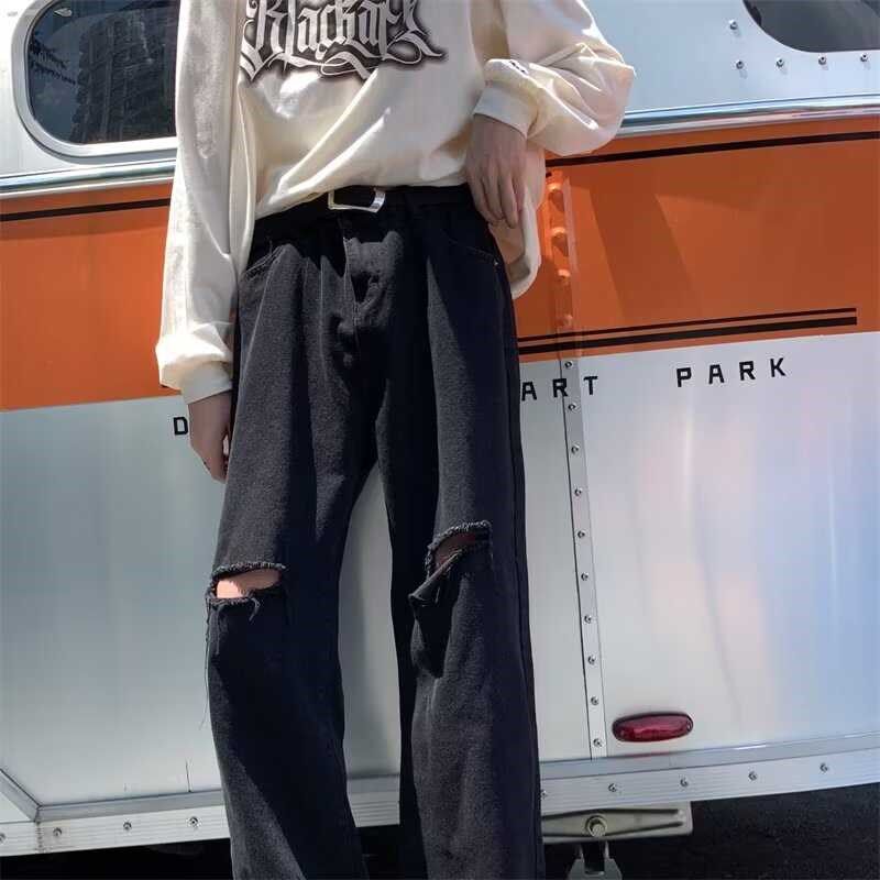 膝盖破洞牛仔裤男女春夏季暗黑高街直筒窄版阔腿水洗宽松休闲长裤