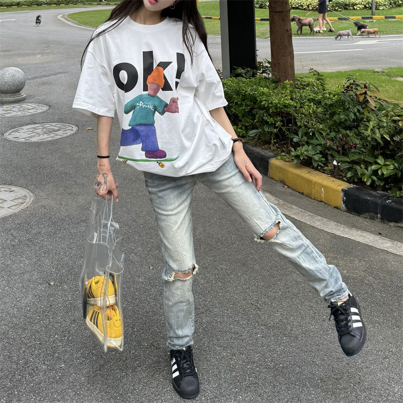 膝盖破洞牛仔裤女夏季薄款高街拖地风小众设计感高街美式显瘦辣妹