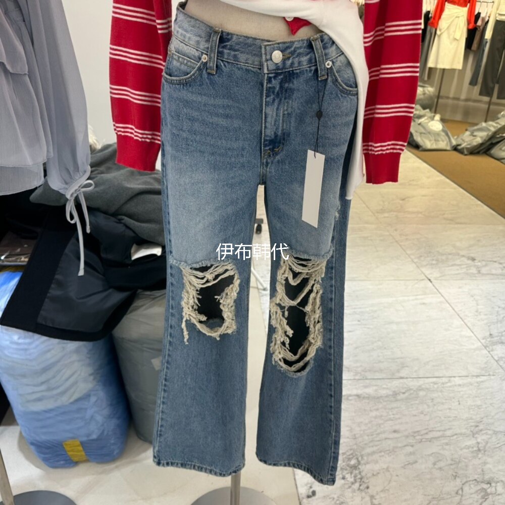 BAGUETTE-韩国东大门正品代购26春款 磨白做旧毛边膝盖破洞牛仔裤