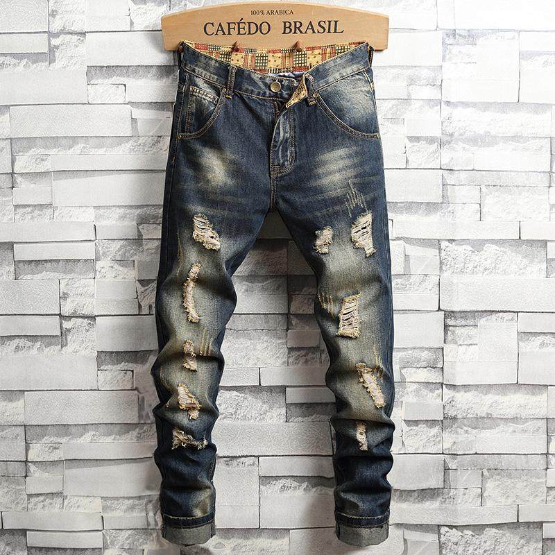 春秋季破洞牛仔裤男潮牌直筒宽松复古膝盖刮烂个性乞丐长裤子韩版