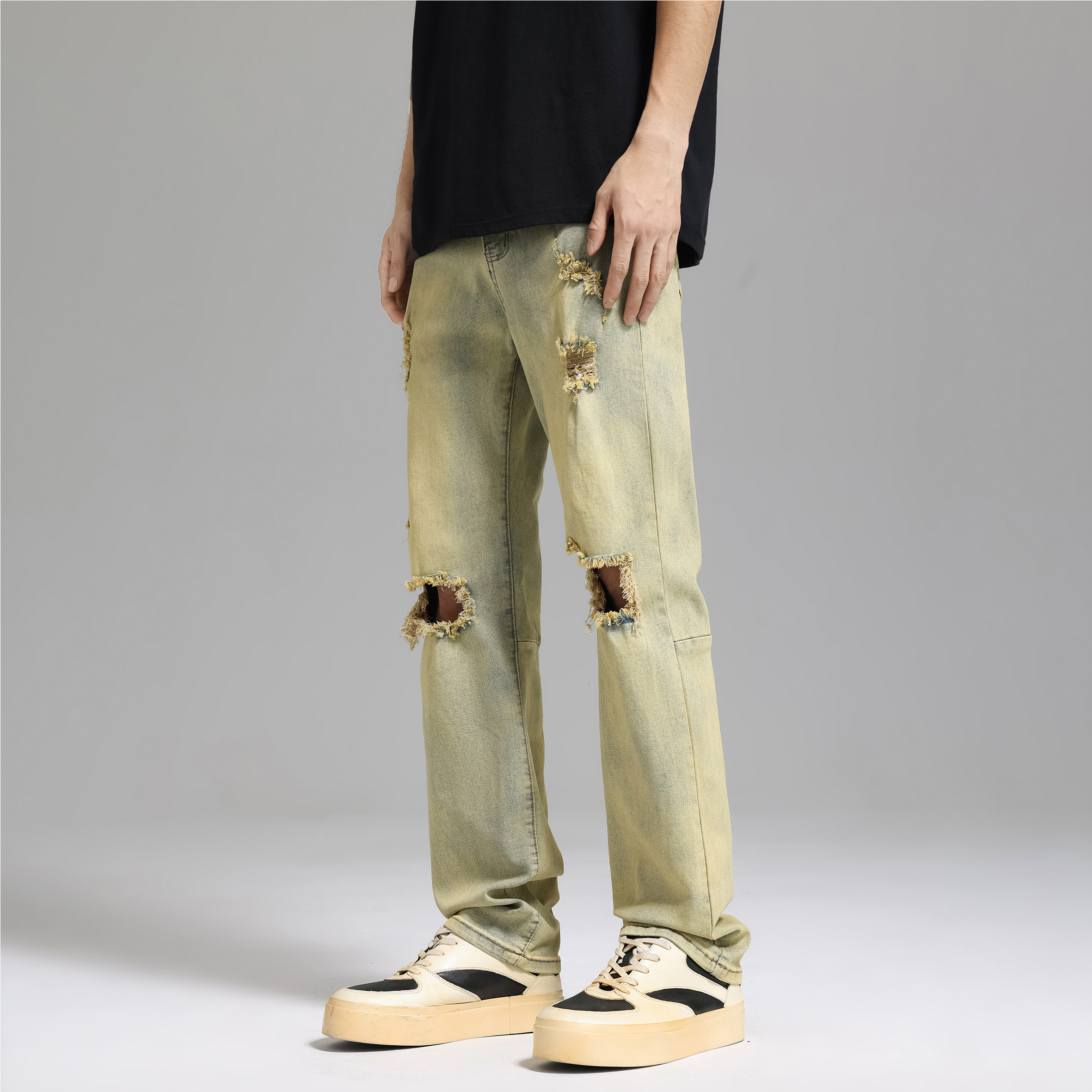 网红同款黄泥色膝盖破洞牛仔裤国潮美式高街vibe风直筒修身情侣装