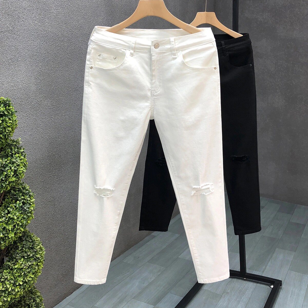 欧洲站潮牌春夏季破洞膝盖牛仔裤男弹力修身小脚休闲裤潮流九分裤
