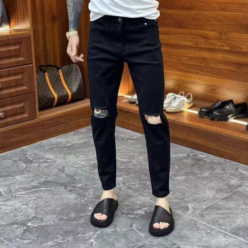 潮牌高品质d男装黑色膝盖破洞牛仔裤2024春夏韩版修身小脚九分裤