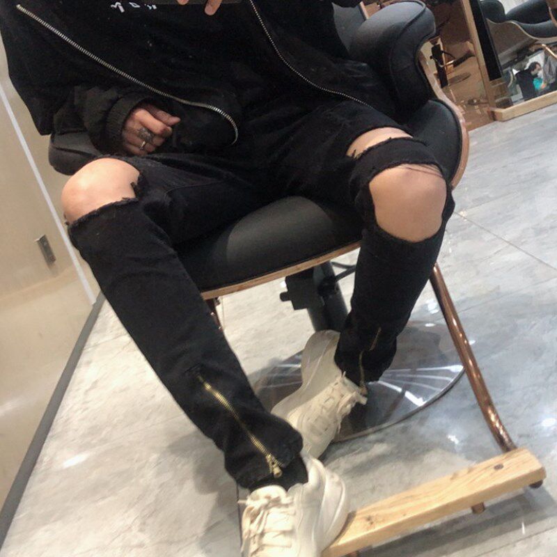 EXO权志龙同款JEANS高街潮男膝盖破洞小脚牛仔裤刀割弹力乞丐裤子