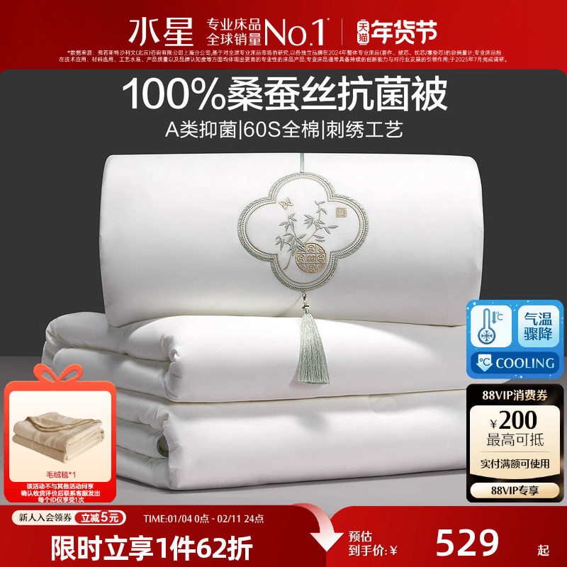 水星家纺100%桑蚕丝被子母被60支全棉抗菌蚕丝结婚被子被芯新春礼