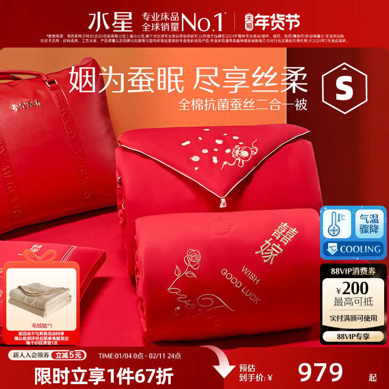 水星家纺蚕丝被100%桑蚕丝喜被婚庆结婚子母被二合一冬被保暖送礼