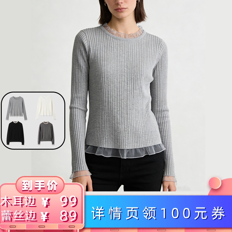卢昱晓同款 Kroche 假两件 浪漫蕾丝拼接翻领木耳边针织打底开衫