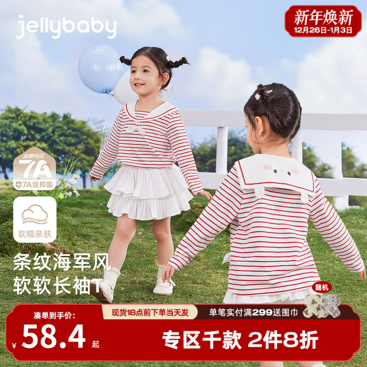 [7A抗菌]女童长袖t恤6岁宝宝秋季条纹衣服小童海军领儿童秋装上衣