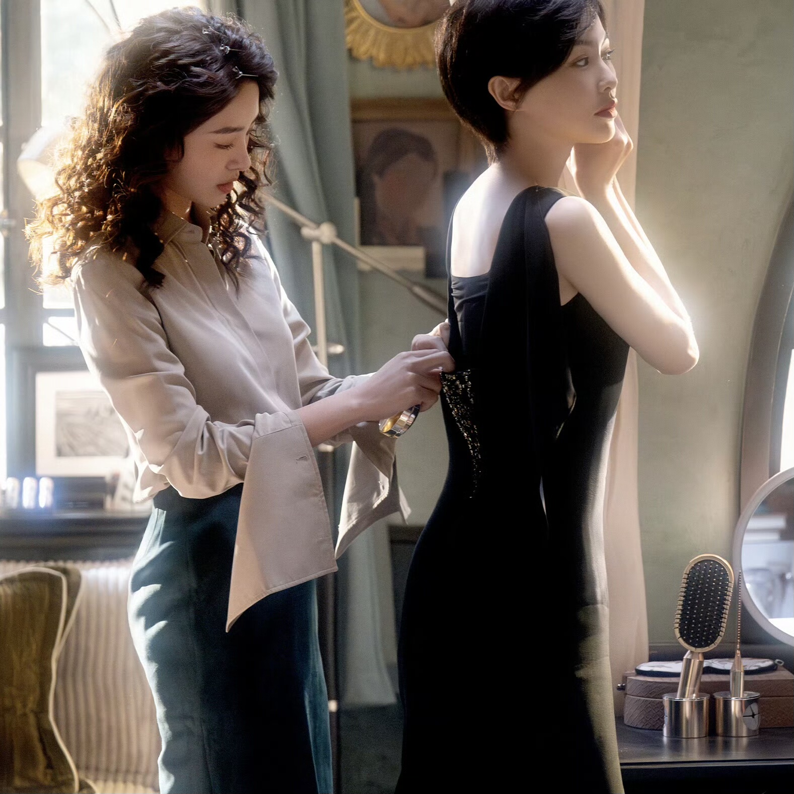 我们的客栈唐嫣明星同款小众修身上衣酒红色方领丝绒泡泡袖女衬衫