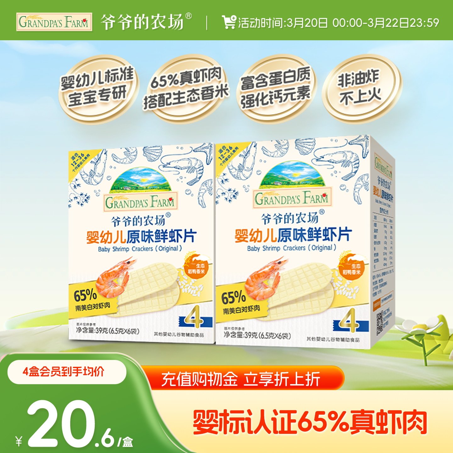 爷爷的农场虾片婴幼儿磨牙饼干非油炸鲜虾片香脆虾饼儿童宝宝零食
