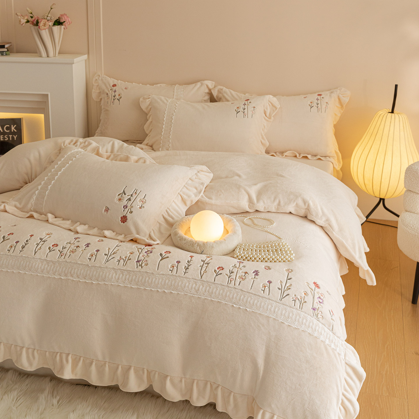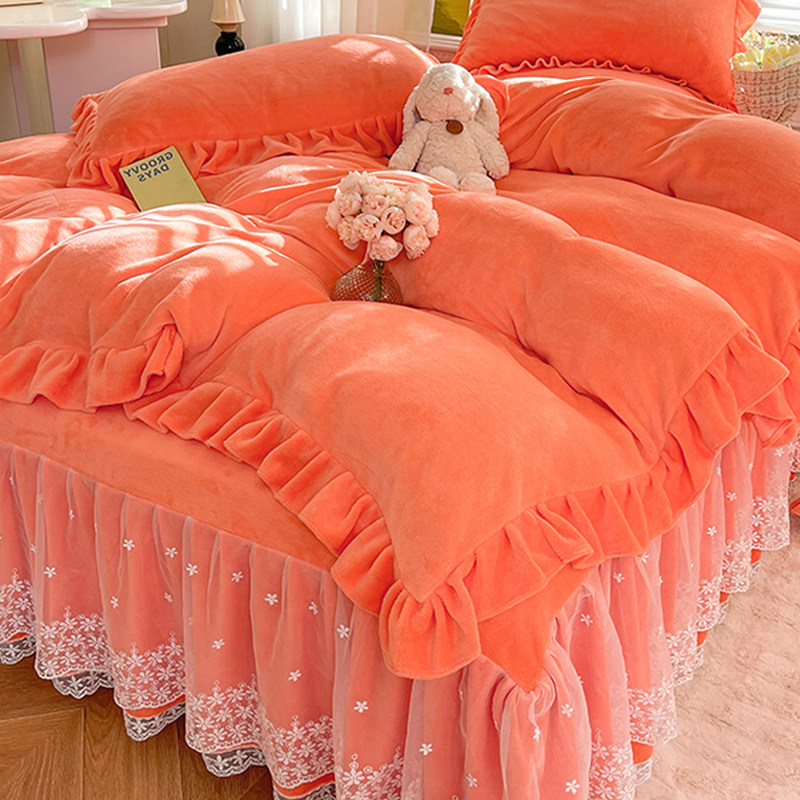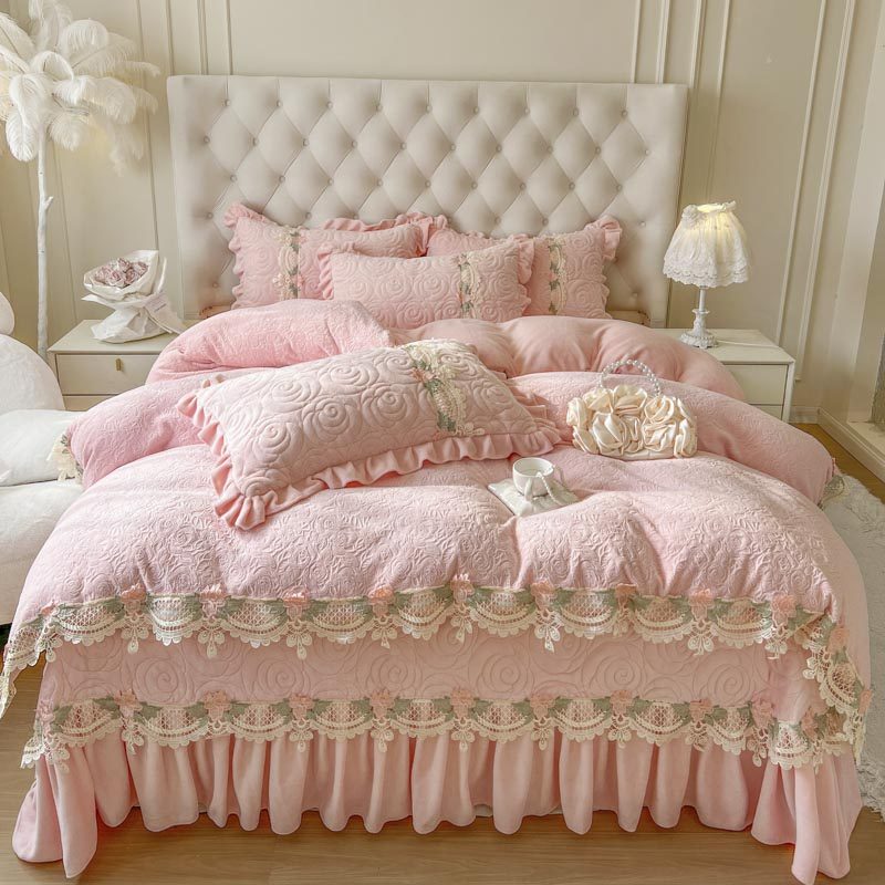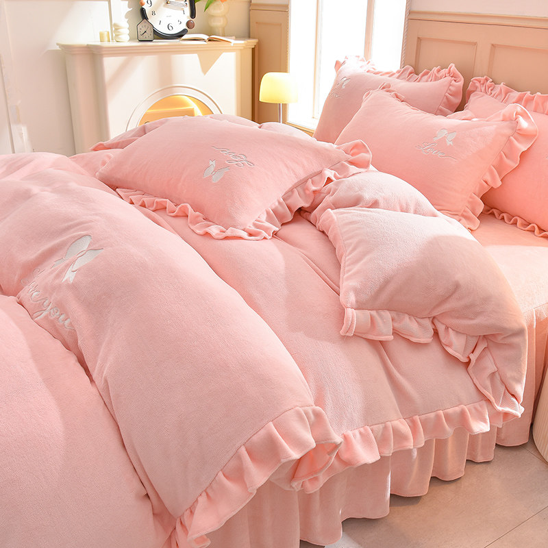 韩式公主风牛奶绒床盖四件套冬季少女心保暖加绒加厚床单花边被套