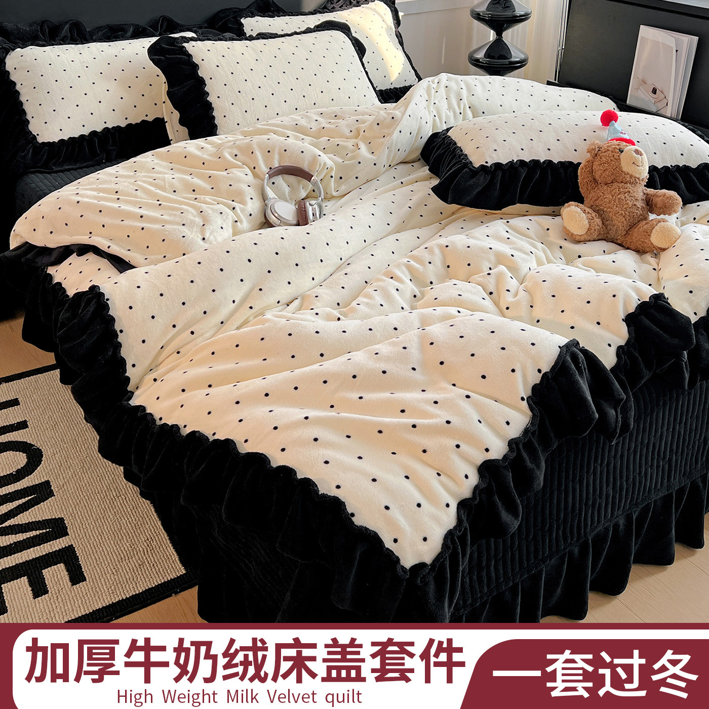 黑白波点牛奶绒花边床盖四件套冬天保暖韩式双面绒被套公主风床单
