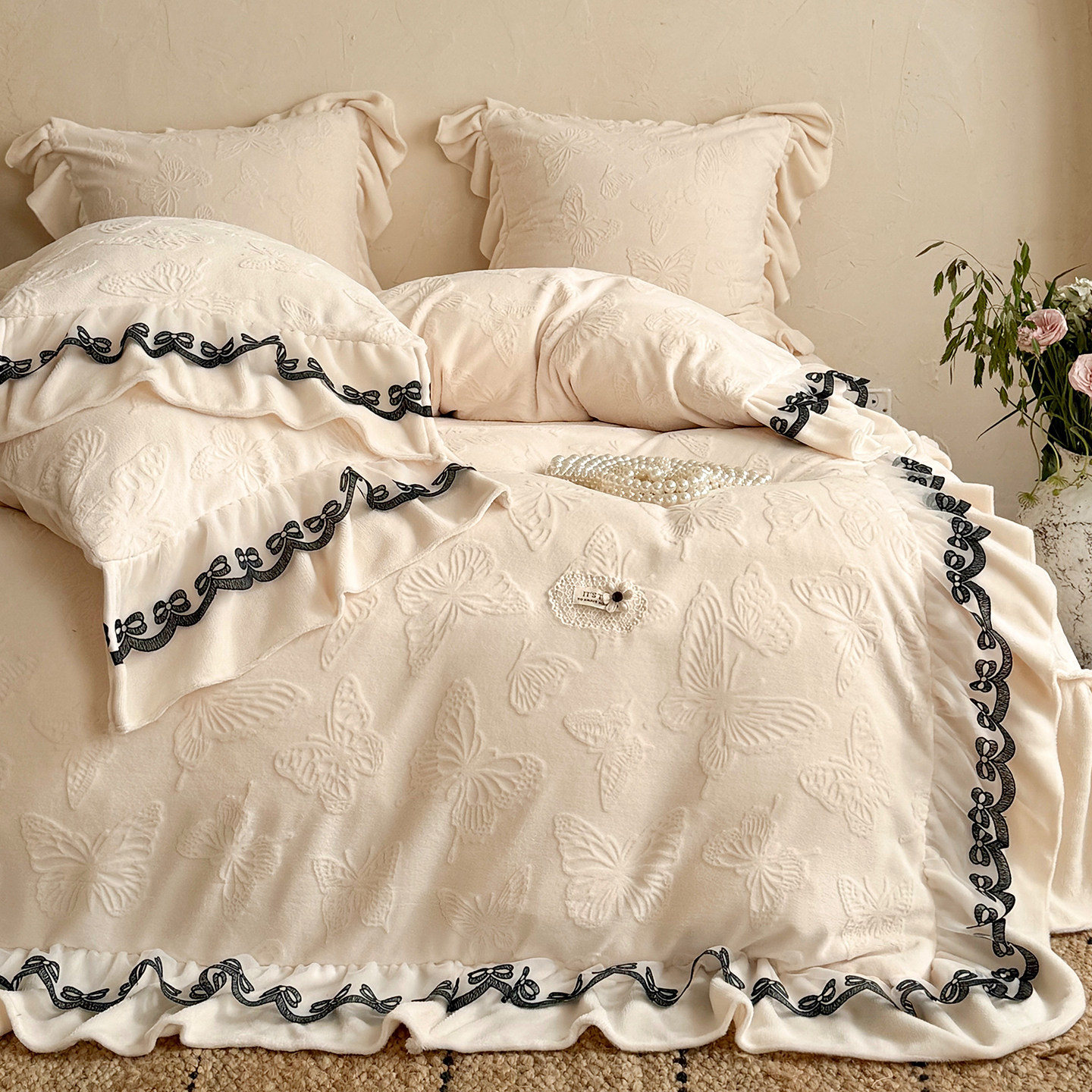 韩版公主风牛奶绒四件套床盖款冬季加厚珊瑚绒花边被套夹棉床裙单