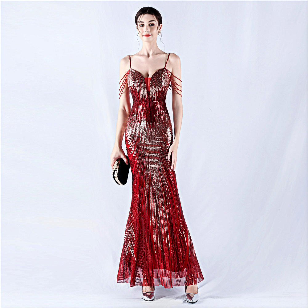 2025新款公司年会聚会晚礼服女气质珠片显瘦鱼尾主持人长款连衣裙
