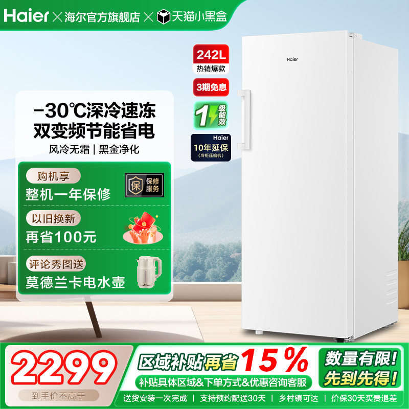 【风冷无霜】海尔242L家用小冰柜深冷全冷冻低温一级节能冰柜冰箱