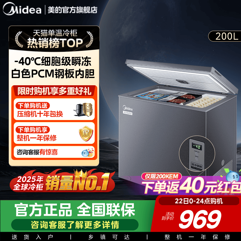 【-40℃】美的100/200升超低温冰柜家用小型冷冻冷藏一级冰箱冷柜