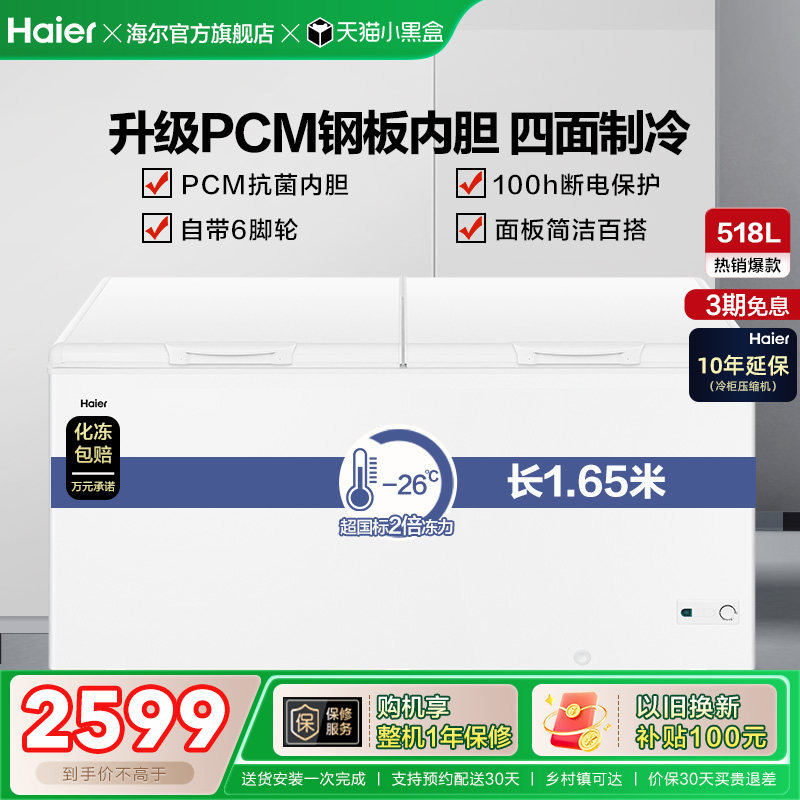 海尔518升大容量冰柜家用商用卧式大冷柜保鲜全冷冻冰箱冷藏柜