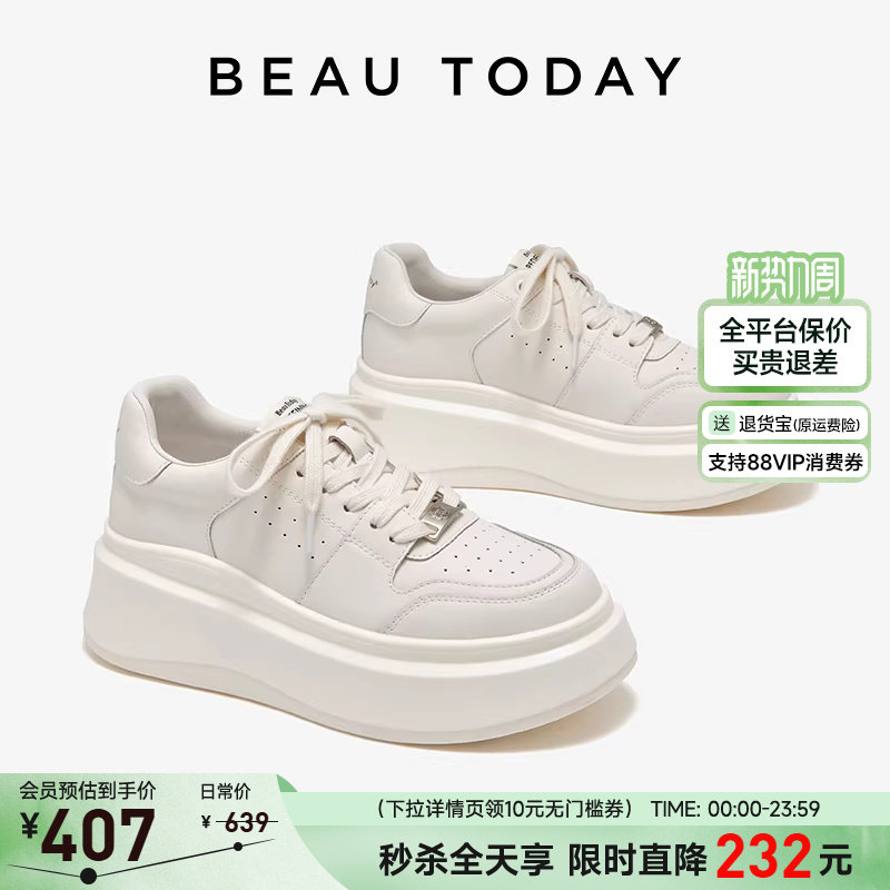 BeauToday厚底小白鞋女内增高单鞋春季休闲鞋白色板鞋女款老爹鞋