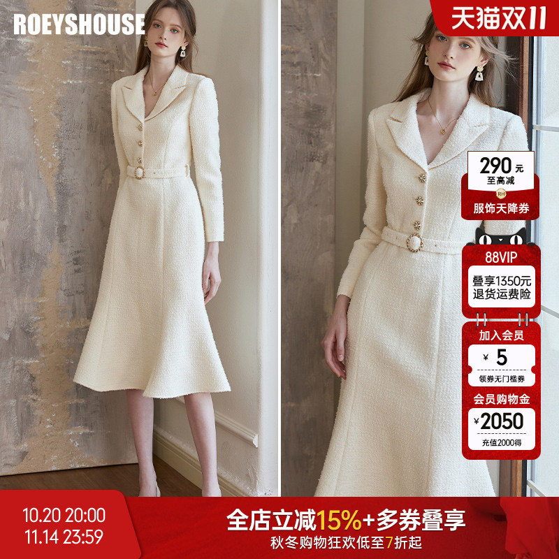 罗衣法式小香风粗花呢鱼尾连衣裙2025冬季优雅修身系带裙子09648