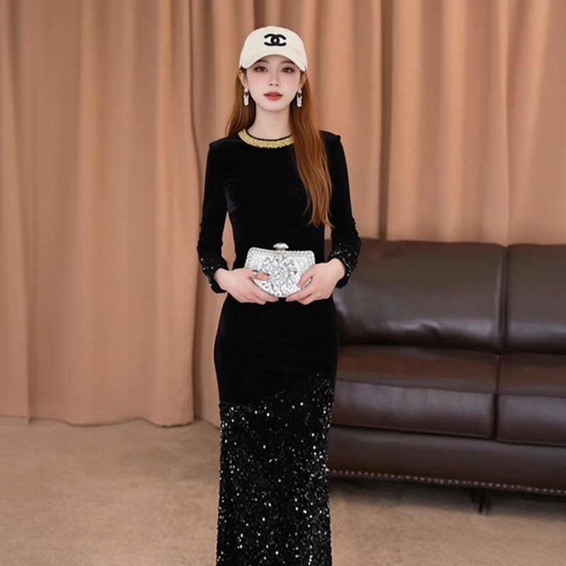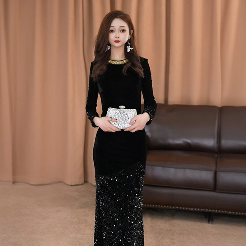 重要场合漂亮裙子高端精致气场强大御姐黑色亮片丝绒礼服连衣裙冬