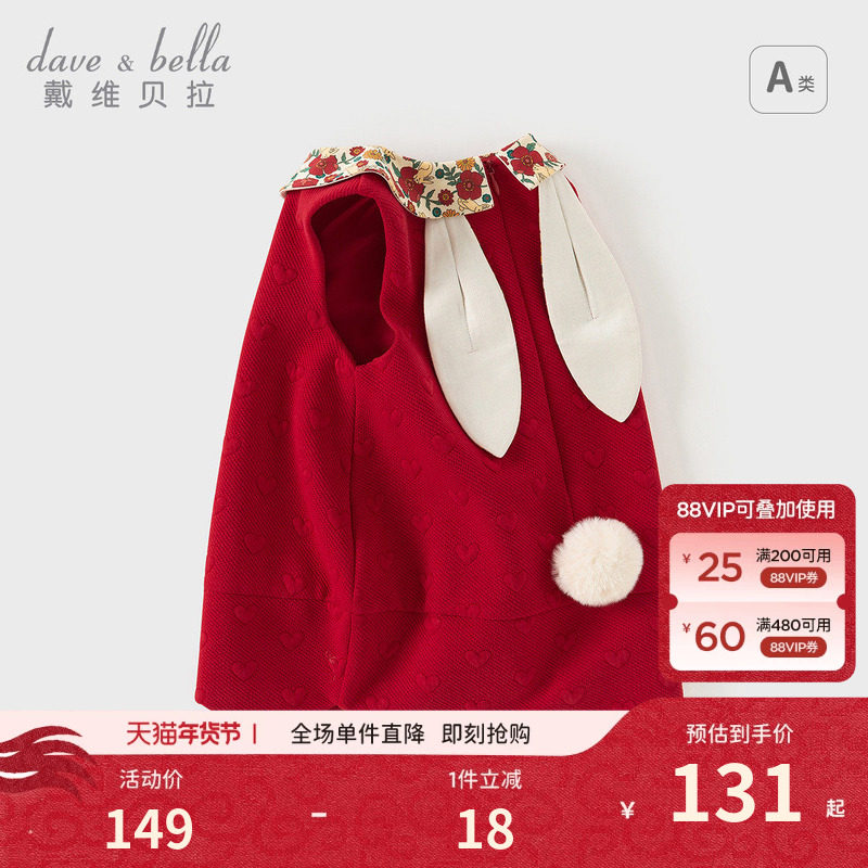 戴维贝拉女童连衣裙秋冬儿童兔耳朵红色新年裙子宝宝周岁可爱礼服