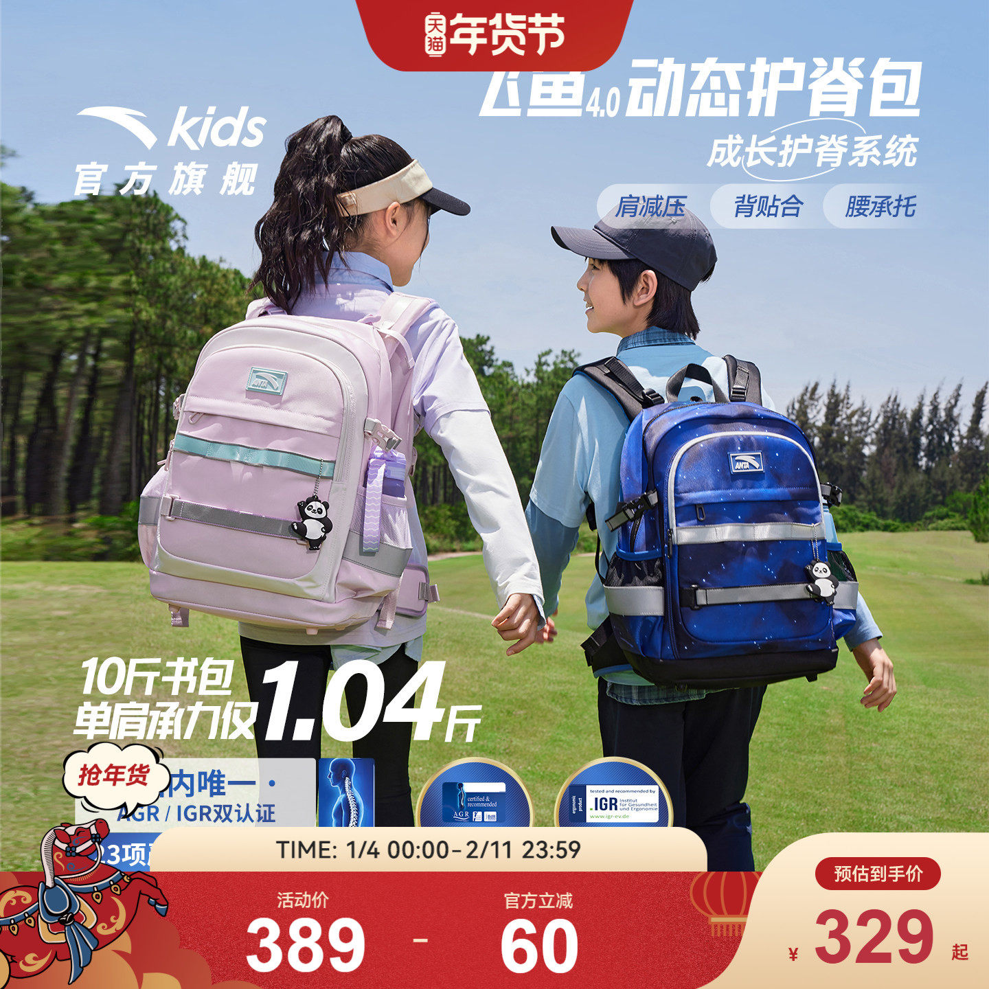 安踏儿童书包超轻护脊减负2026年新款男女童双肩背包防水大容量