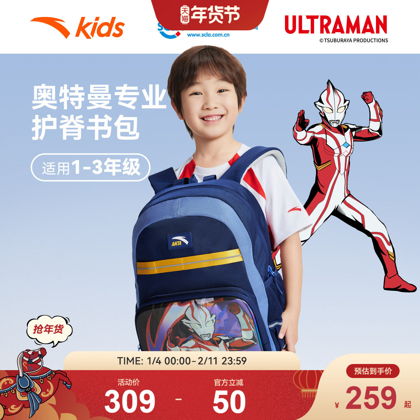 安踏儿童书包奥特曼正版书包小学生书包男1-3年级书包减负双肩包