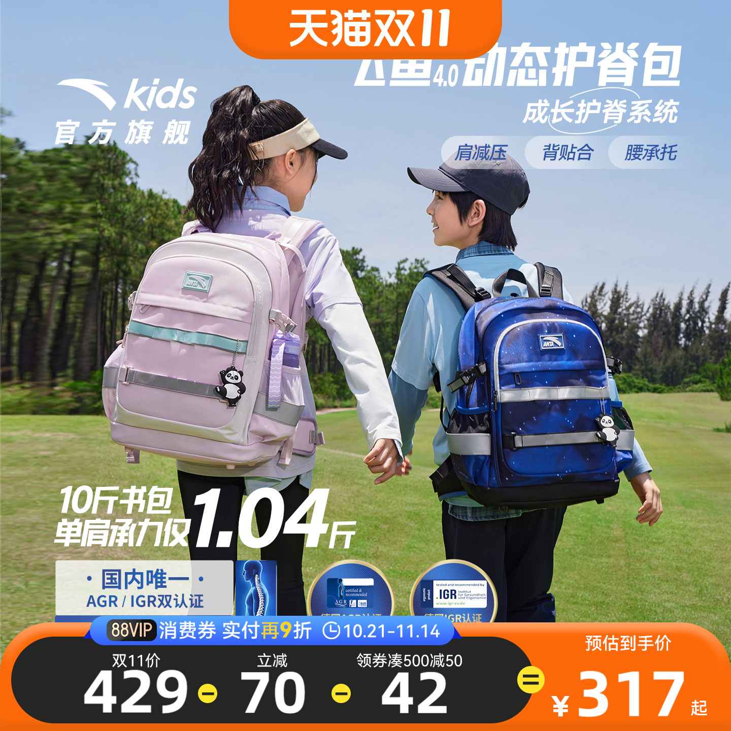 安踏儿童书包男小学生书包女飞鱼4.0动态护脊书包双肩包减负背包