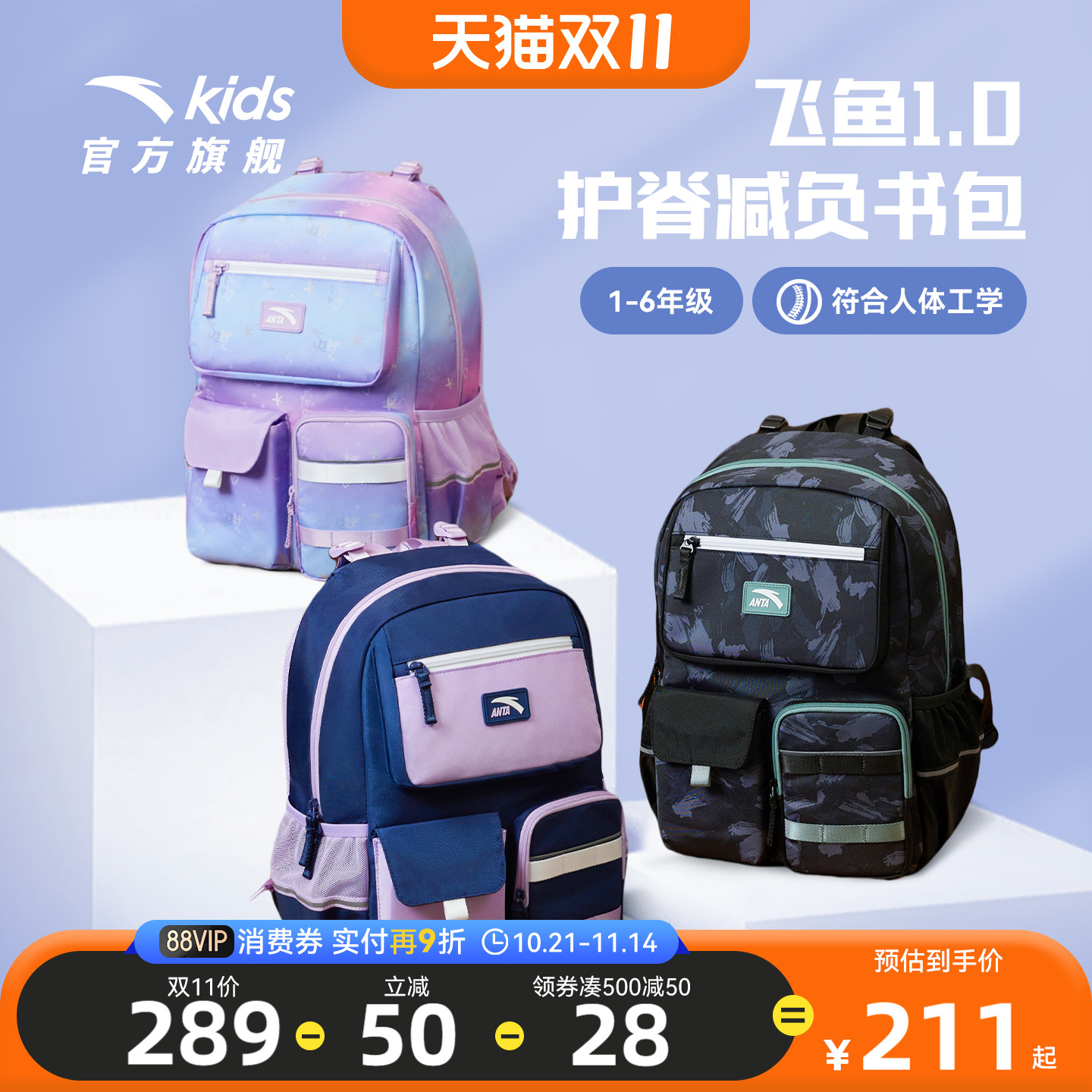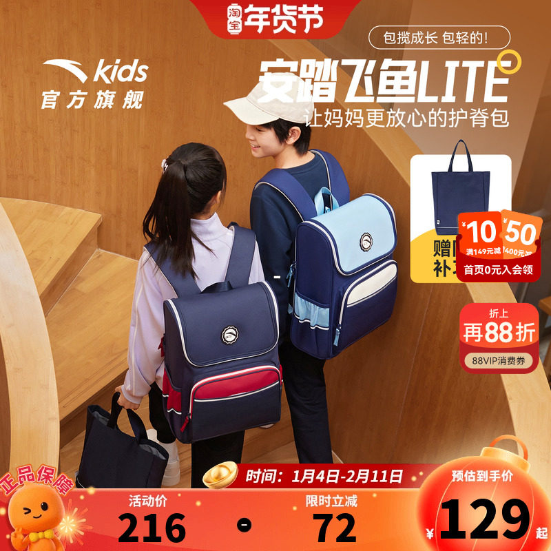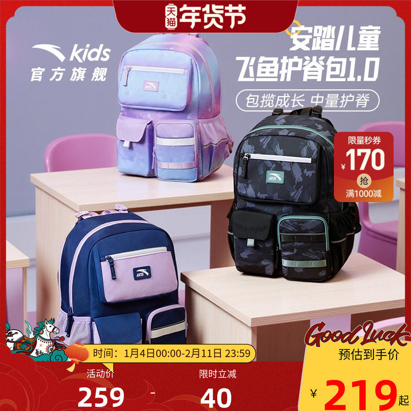 【商场同款】安踏儿童书包男小学生书包女飞鱼1.0护脊双肩包背包