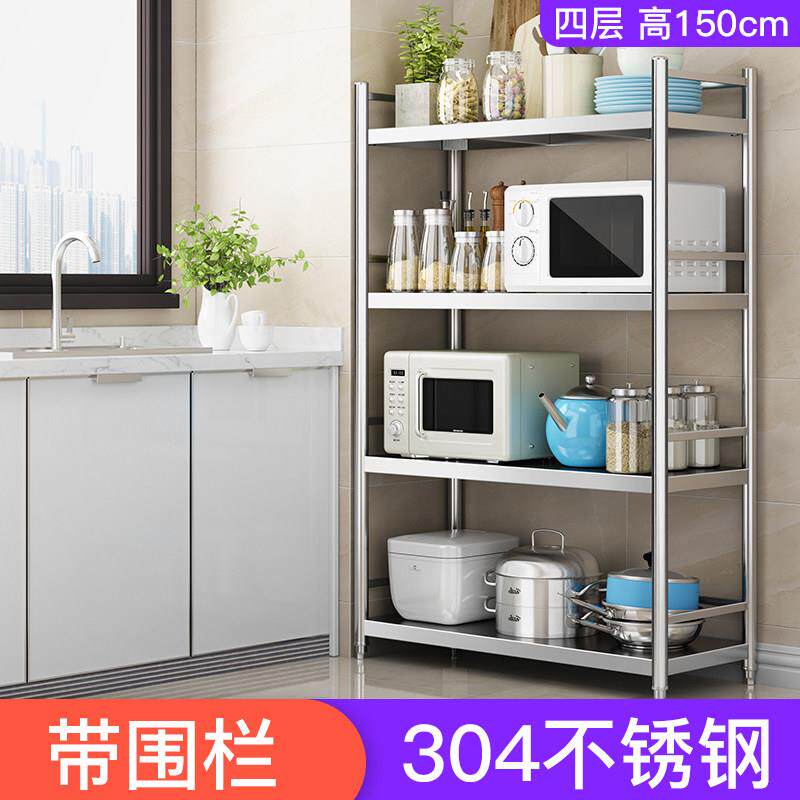 厨房置物架落地多层烤箱微波炉304不锈钢置物4层架收纳架子带围栏