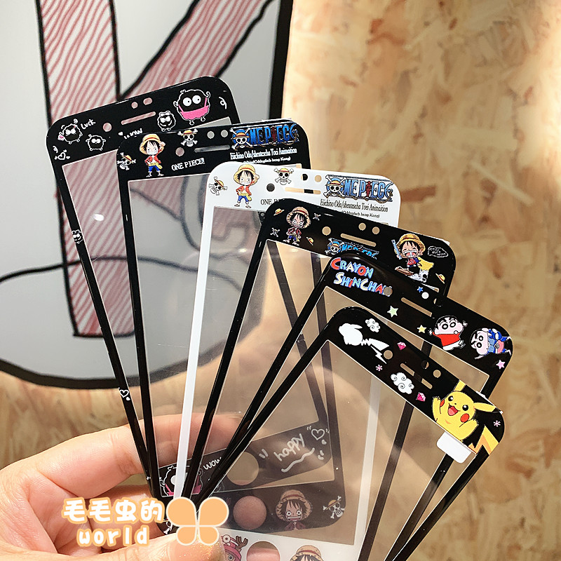 黑底小煤球适用苹果6s/7/8卡通钢化玻璃贴膜海贼王路飞新款iPhone6/7/8plus全屏彩色手机彩膜皮卡丘SE2/3