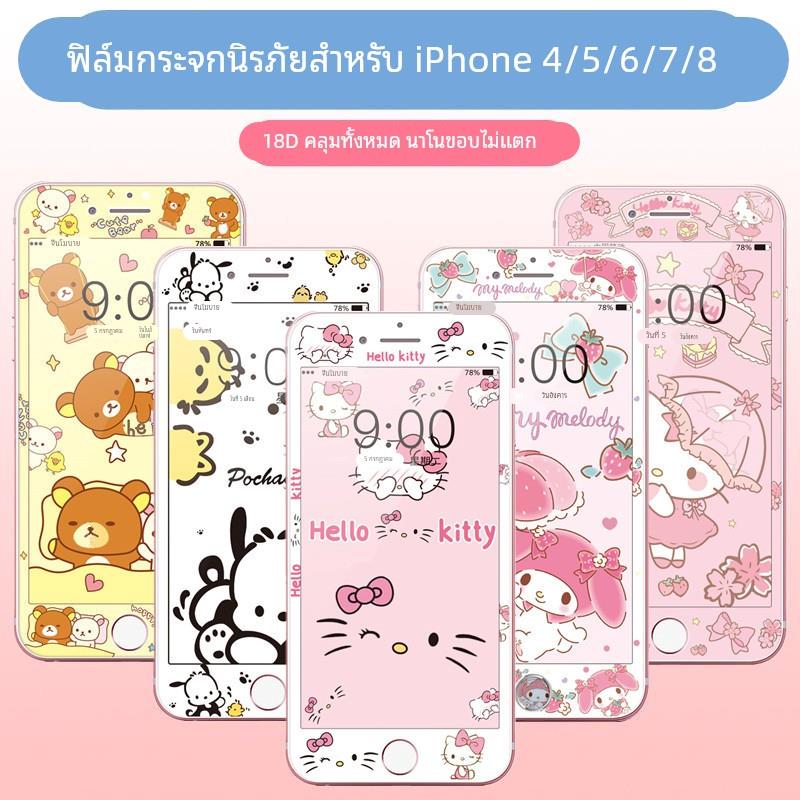 三丽鸥凯蒂猫kitty适用苹果4s/5s彩膜6s/7/8卡通玻璃贴膜美乐蒂iPhone7/8plus不碎边可爱浮雕彩膜SE2/3学生款