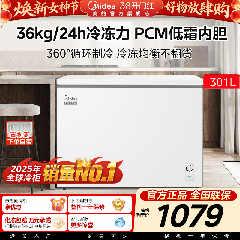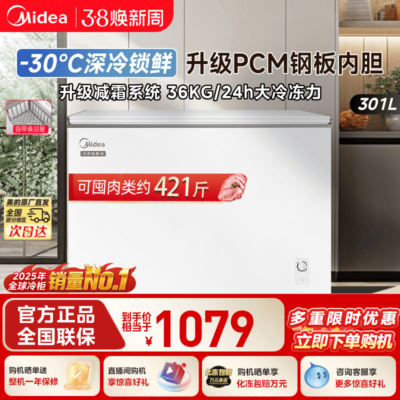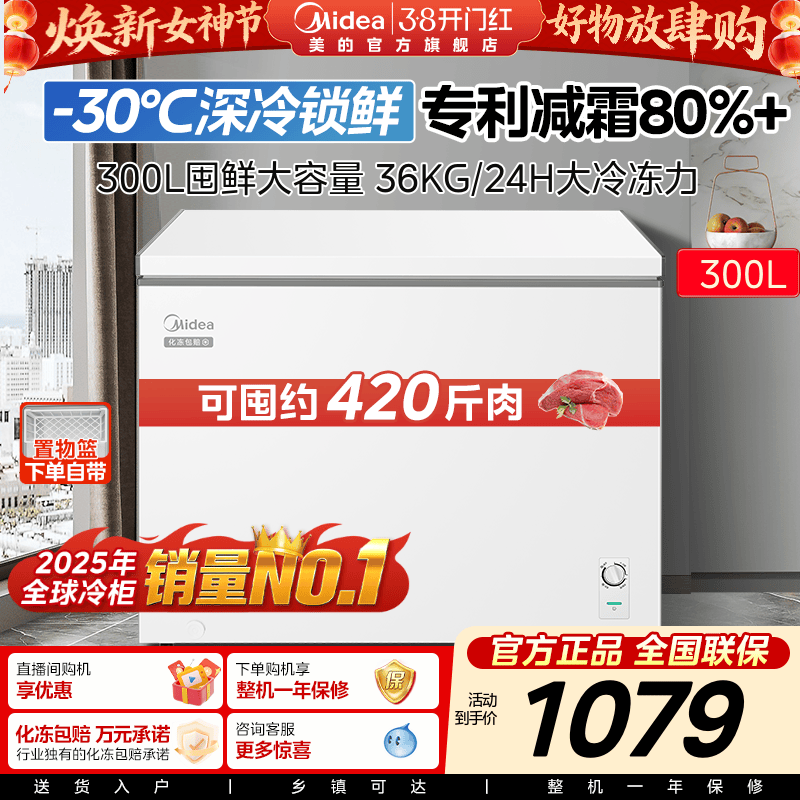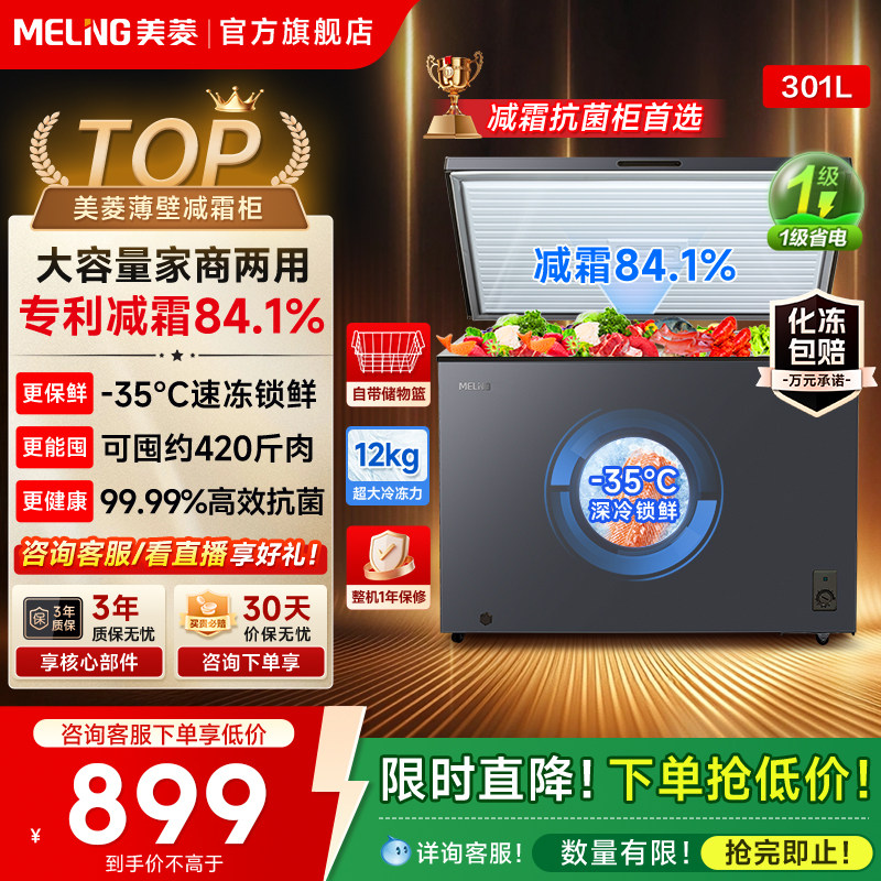 美的300L大容量冰柜家用商用冷柜冷冻冷藏两用一级冰箱官方旗舰店