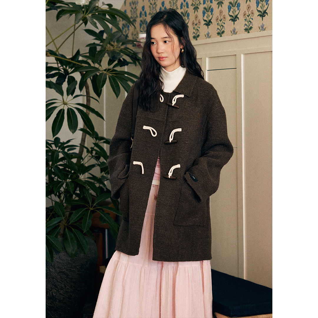 乐町2025冬季新款学院风毛呢大衣秋冬牛角扣中长款外套C1AAD4228