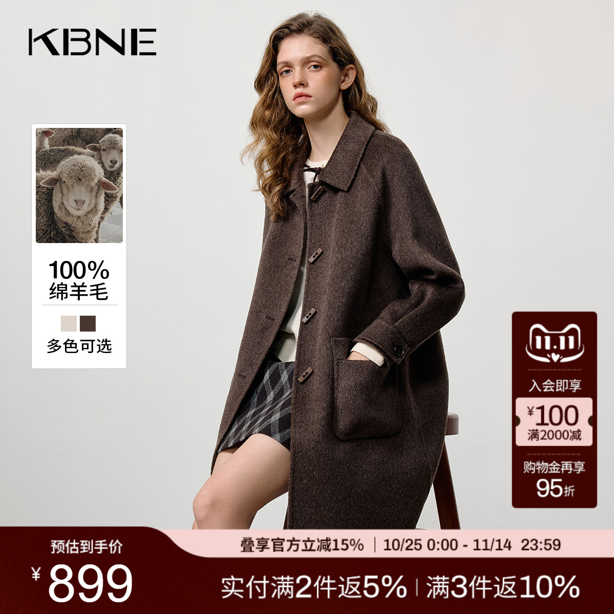 【100%绵羊毛】KBNE2025冬季新款方形牛角扣中长款羊毛毛呢大衣女