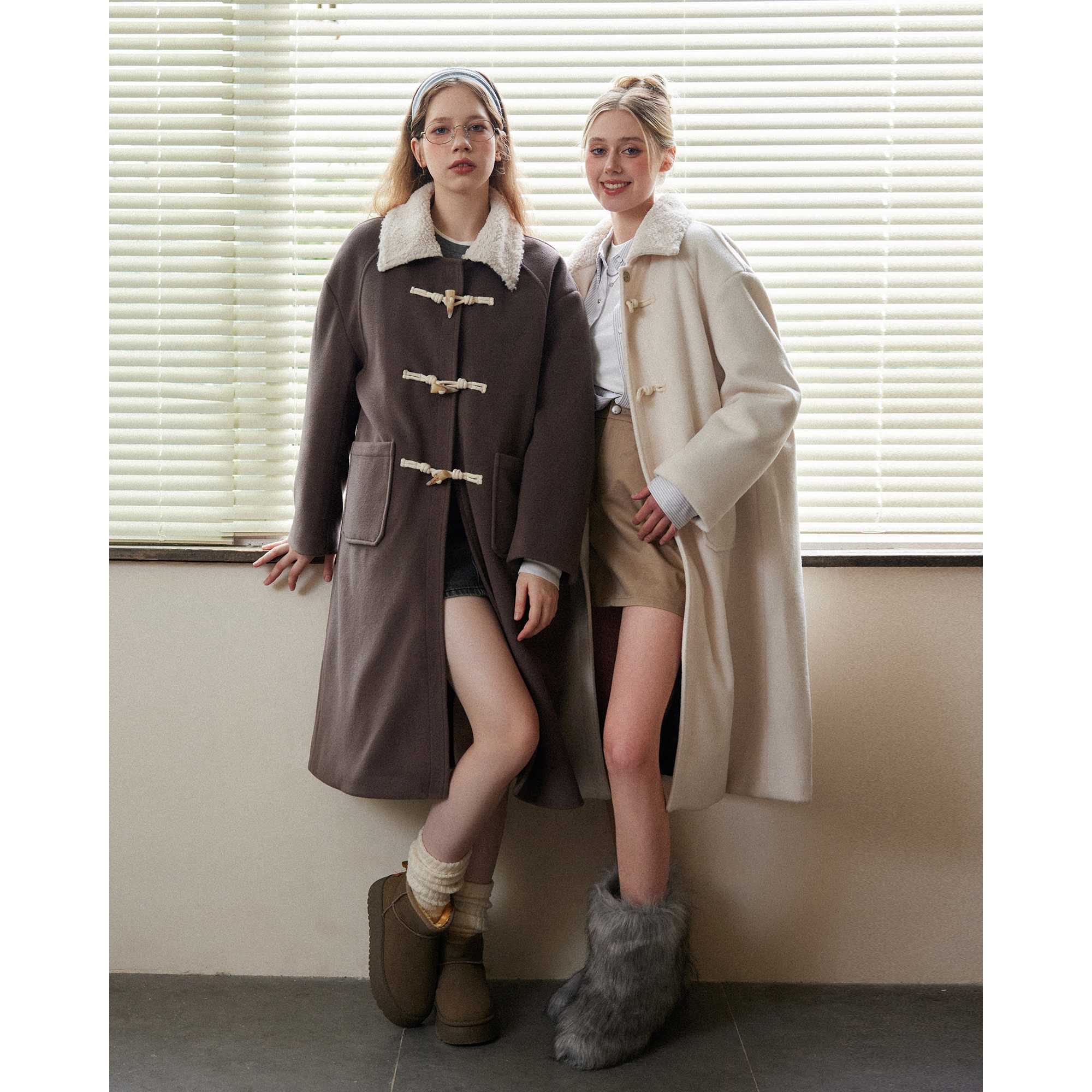 Basic House/百家好羊羔毛外套女2025冬季新款复古牛角扣中长款
