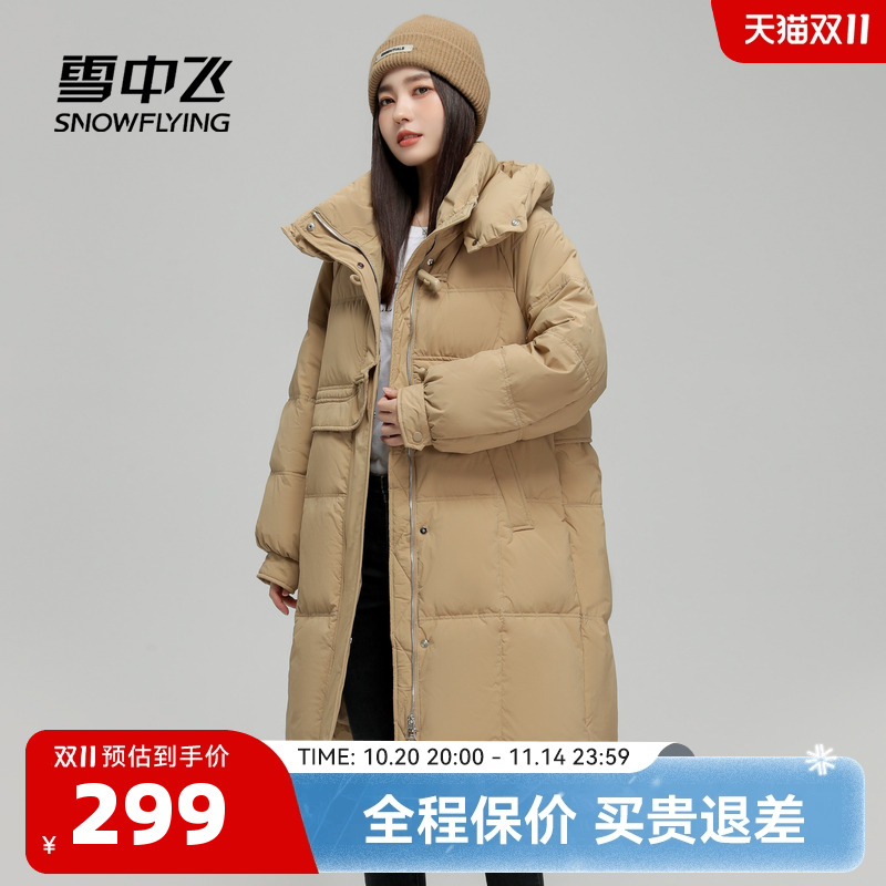 雪中飞2025冬新款女士中长款连帽羽绒服牛角扣休闲简约气质防风