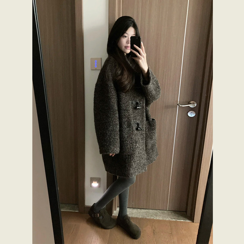 韩系复古灰棕色立领呢子大衣女秋冬季小个子牛角扣中长款毛呢外套